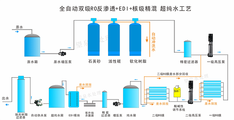 源水泵      砂濾器       碳濾器     軟水器    精濾保安濾器      RO反滲透主機(jī)      純水箱    (紫外線殺菌器      各個(gè)管線飲水機(jī))EDI模塊 超純水箱