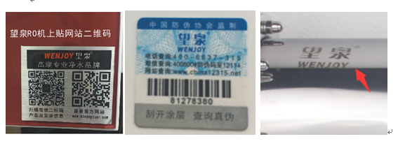 2)望泉RO產(chǎn)品有防偽貼和產(chǎn)品網(wǎng)站二維碼貼  2)望泉UF超濾機上有防偽貼和不銹鋼管上刻商標(biāo)等.