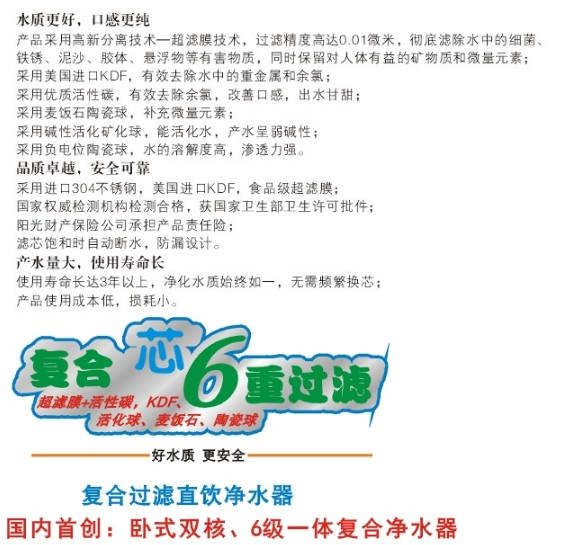 使用壽命: ≥3年(當原水為市政自來水時,根據水質差異,濾芯使用壽命不同,但一般不低于3年)